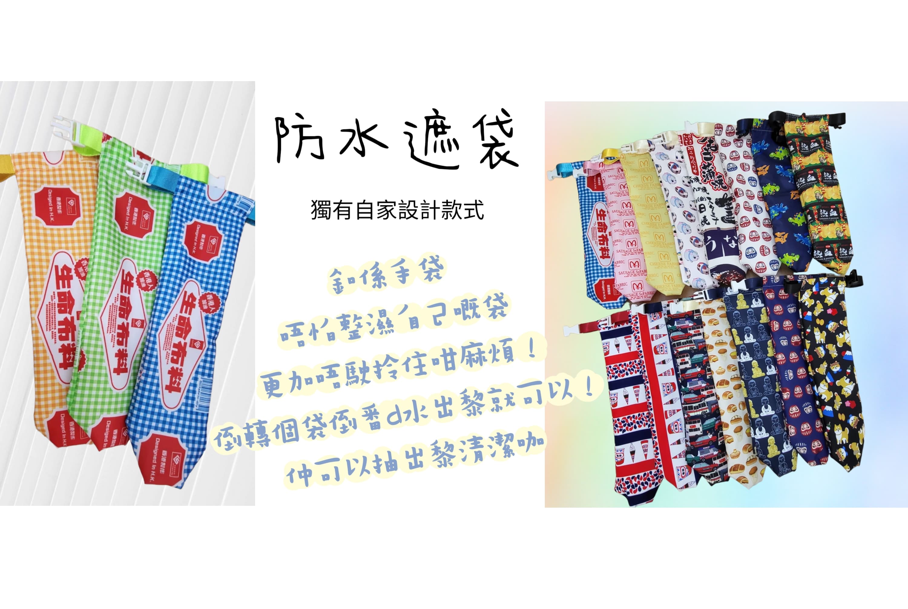 防水遮袋(約12cm闊口,長約32cm, 全人手製作,或存在1-2cm誤差)獨有自家設計款式 只此一家 環保方便!釦係個袋唔駛整濕自己嘅手袋,更加唔駛拎住咁麻煩!倒轉個袋倒番d水出黎就可以!又可以抽出黎清潔~p.s. 每塊布嘅編印圖案不同, 圖案可能有點偏差..